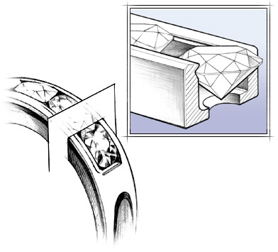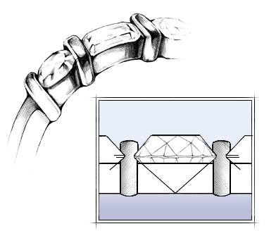 With a channel setting, the stones are set between vertical walls of metal. In this style of setting no metal separates the stones from one another. Channel setting has gained popularity and although contemporary, it is considered a classic style.