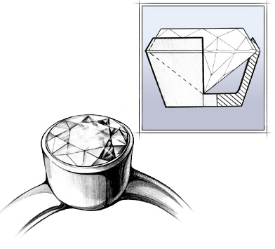A half-bezel setting is similar to a bezel setting, except the bezel does not entirely surround the stone. Instead the bezel encompasses the outer portion of the stone, allowing the center section of the stone to remain open. This allows additional light to create a higher degree of brilliance.